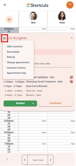 - Select the appointment, click on the menu icon and from the drop down choose Customer History to view past interactions and details.